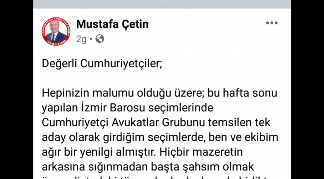 Değerli Cumhuriyetçiler;Hepinizin malumu olduğu üzere; bu hafta sonu yapılan İzmir Barosu seçimlerinde Cumhuriyetçi Avukatlar Grubunu temsilen tek aday olarak girdiğim seçimlerde, ben ve ekibim ağır bir yenilgi almıştır. Hiçbir mazeretin arkasına sığınmadan başta şahsım olmak üzere, listedeki tüm yol arkadaşlarımla birlikte bu acı sonucun her türlü faturasını göğüslemeye hazır olduğumuzu bilmenizi isterim.