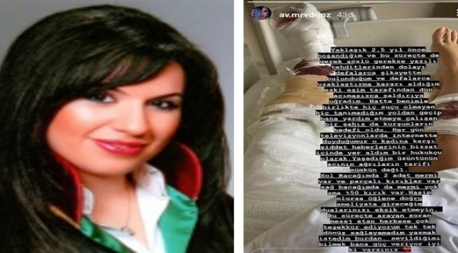 Eskişehir'de 2,5 yıl önce boşandığı Mete A. (37) tarafından alışveriş merkezinin otoparkında tabancayla bacaklarından vurulan Avukat Merve Gül Durmaz (34), ameliyat edildi. Bacağına platin takılan Durmaz, A.’nun tutuklu yargılanması gerektiğini ifade ederek, “Bu tür insanların dışarda olması, cesaretlenmesi, elini kolunu sallayarak sokak ortasında insan vurmaları gerçekten akıl alır gibi değil” dedi.