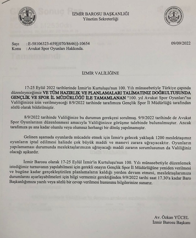İzmir Barosu tarafından 1200 avukatın katılımıyla yapacağı futbol, basketbol, voleybol müsabakaları iptal edildi. Valiliğin iptal kararı sonrası Türkiye genelinden gelecek olan avukatlar, uçak biletlerini ve otel rezervasyonlarını iptal etmek zorunda kaldı.
