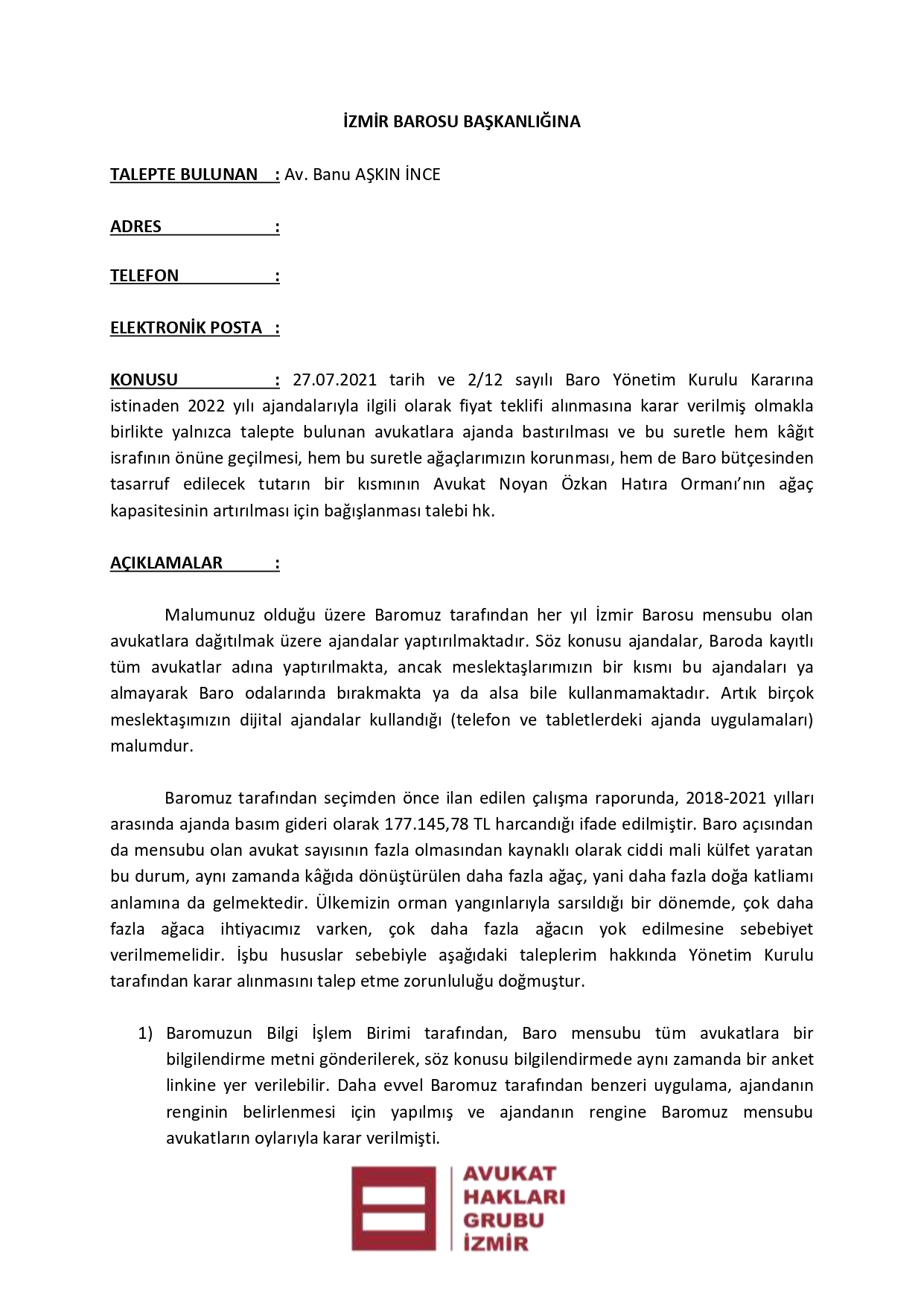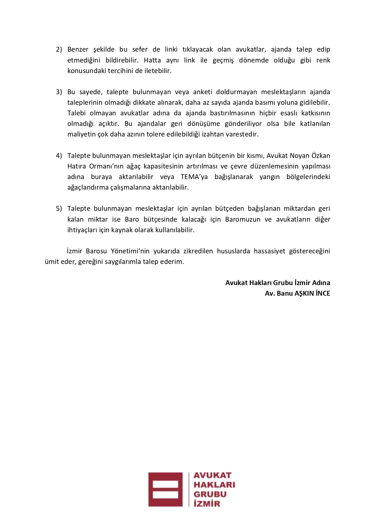 AHG İzmir adına Av. Banu AŞKIN İNCE, İzmir Barosu'na başvuru yaparak, avukatlar için bastırılacak ajandaların sadece talep eden meslektaşlar için bastırılması, talebi olmayan meslektaşlar için ajanda bastırılmayıp her yönden tasarruf edilmesi talep edilmiştir.