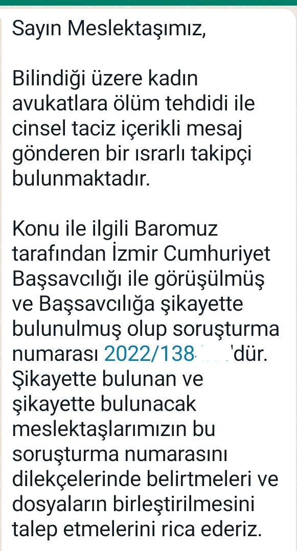 Takibe aldığı kadın avukatlara ölüm tehditi ve cinsel içerikli mesaj atan sapık İzmir Barosu'nu alarma geçirdi. Ayrı tarihlerde mesajı alan kadın avukatlar durumu İzmir Barosu'na bildirdi. İzmir Barosu hemen harekete geçerek durumu Cumhuriyet Savcılığı'na bildirdi.