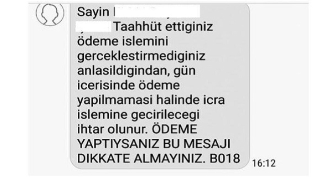 Dolandırıcıların son geliştirdiği yöntem, sahte hukuk bürosu adı altında gönderilen icra takibi SMS’leri oldu. Dolandırıcılık şebekesi, internet üzerinden alışveriş yapan kişilerin telefon numaralarına, “Borcu zamanında ödemezseniz, icra takibi başlatacağız” şeklinde attıkları mesajlarla tüketicileri tuzağa düşürmeye çalışıyor.