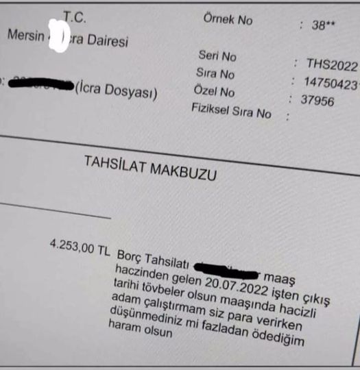 TAHSİLAT MAKBUZUNDA DİKKAT ÇEKEN SATIRLAR:'FAZLADAN ÖDEDİĞİM HARAM OLSUN'