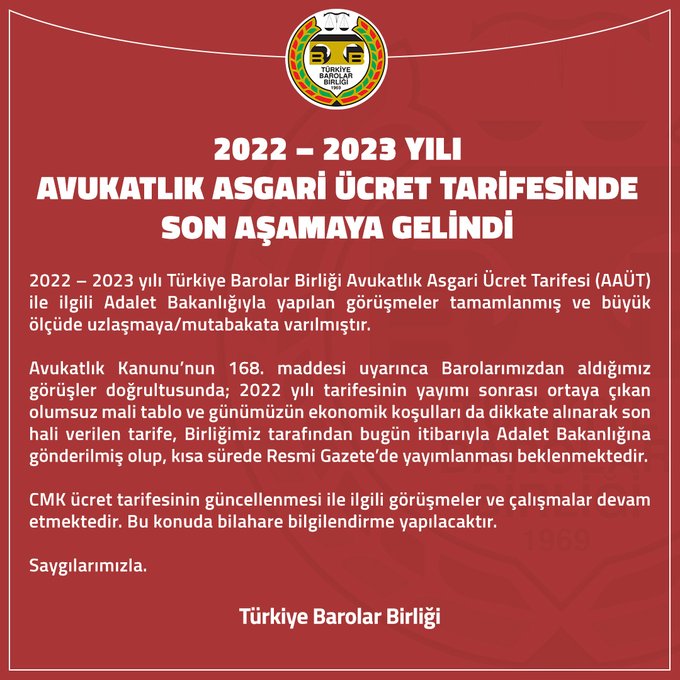 TBB'den Avukatlık Asgari Ücret Tarifesine ilişkin yapılan açıklamada, "2022 – 2023 yılı Türkiye Barolar Birliği Avukatlık Asgari Ücret Tarifesi (AAÜT) ile ilgili Adalet Bakanlığıyla yapılan görüşmeler tamamlanmış ve büyük ölçüde uzlaşmaya/mutabakata varılmıştır." denildi.